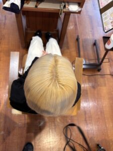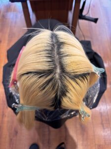 というのも新しく生えてきた黒髪の部分にブリーチを乗せていくんですが、その先の金髪の部分にブリーチが乗っちゃうと最悪切れてしまうからなんです。
