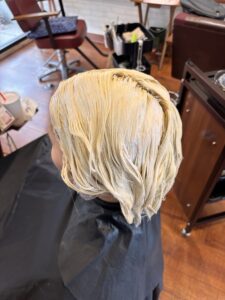 黒髪と金髪がつながったら、手先に残留している染料を取るために、ブリーチを全体にのばしていきます